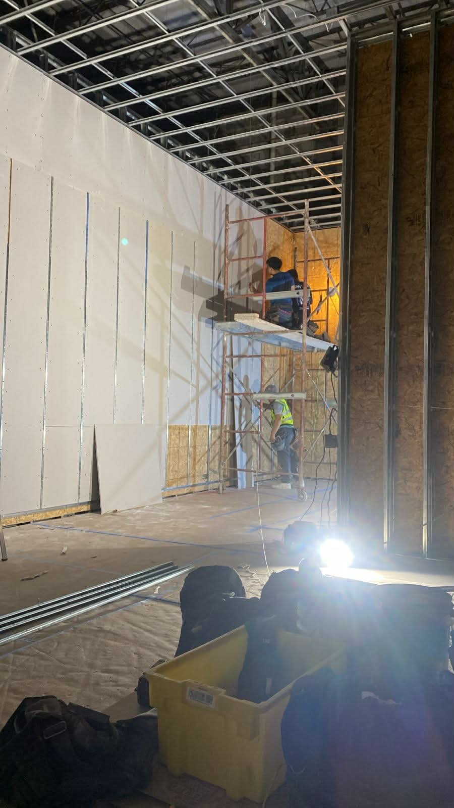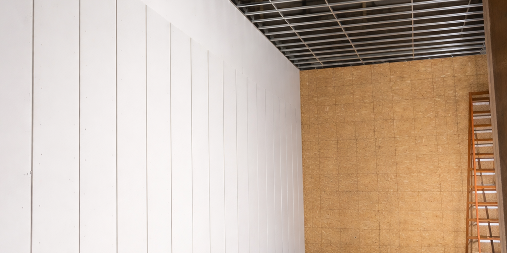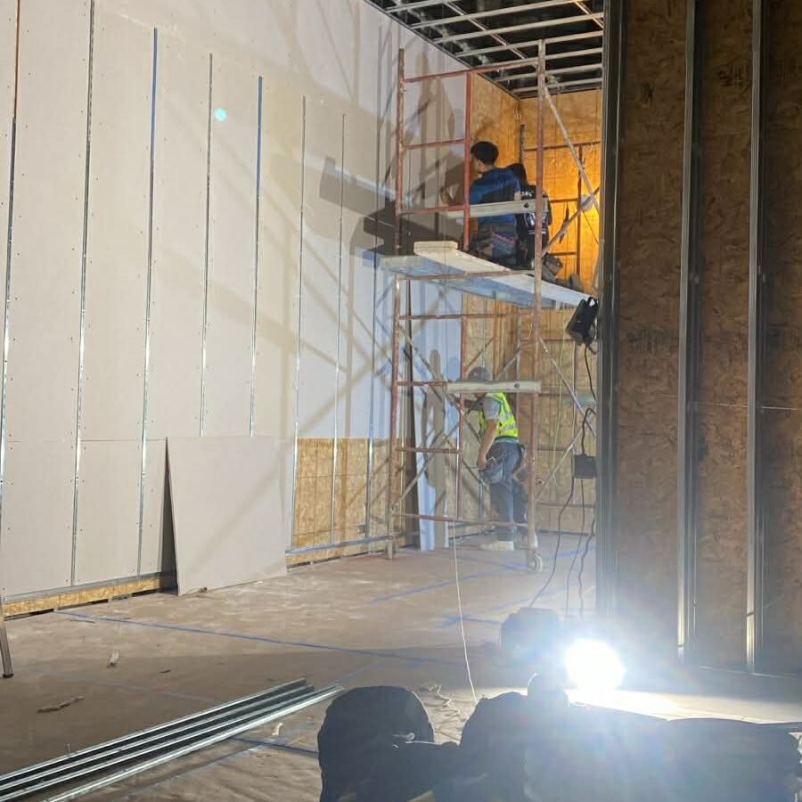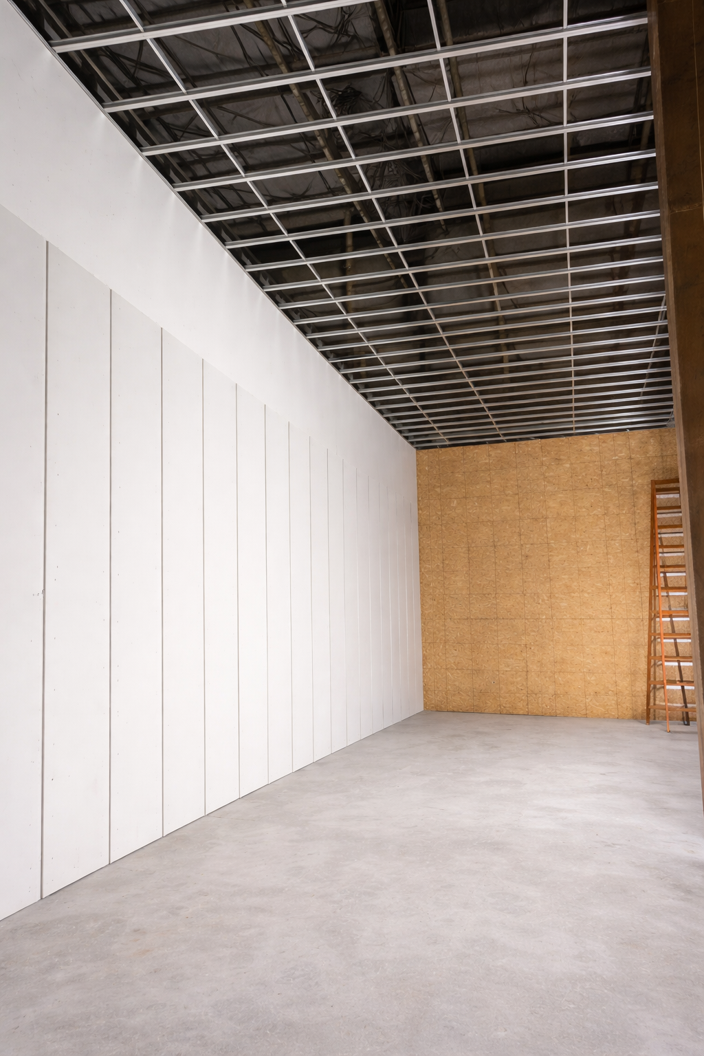 La obra utiliza sistema constructivo ligero con perfilería metálica galvanizada, paneles de yeso, muros OSB, plafón reticular suspendido y cancelería de aluminio con cristal comercial.