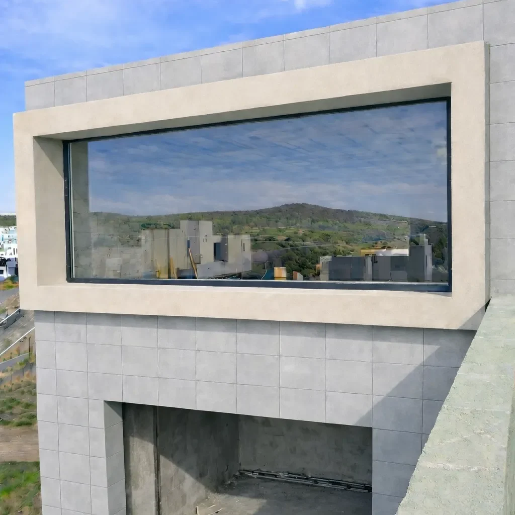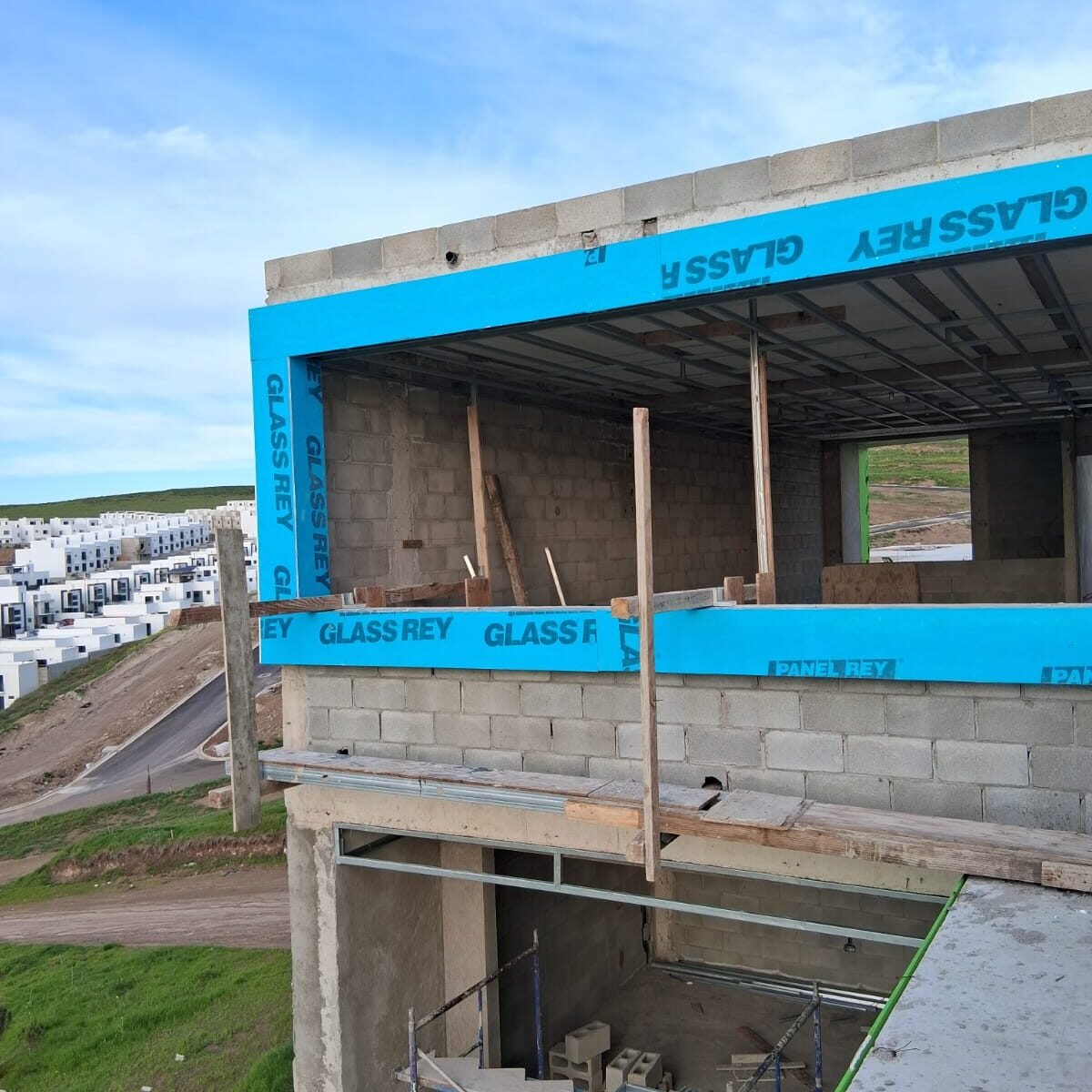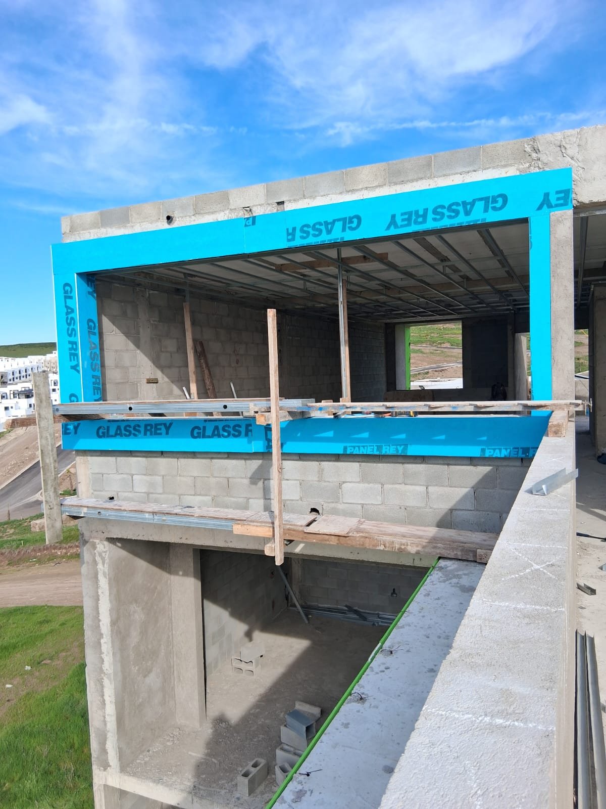 Modernización de fachada realizada por rosaritodrywall en Tijuana, Zona 5y10. El proyecto incluyó la instalación de una estructura robusta de perfilería metálica y un recubrimiento con hoja de yeso para exteriores en color azul. Este sistema, junto con un acabado final en color crema para el marco del ventanal, proporciona una solución estética y duradera contra la intemperie.