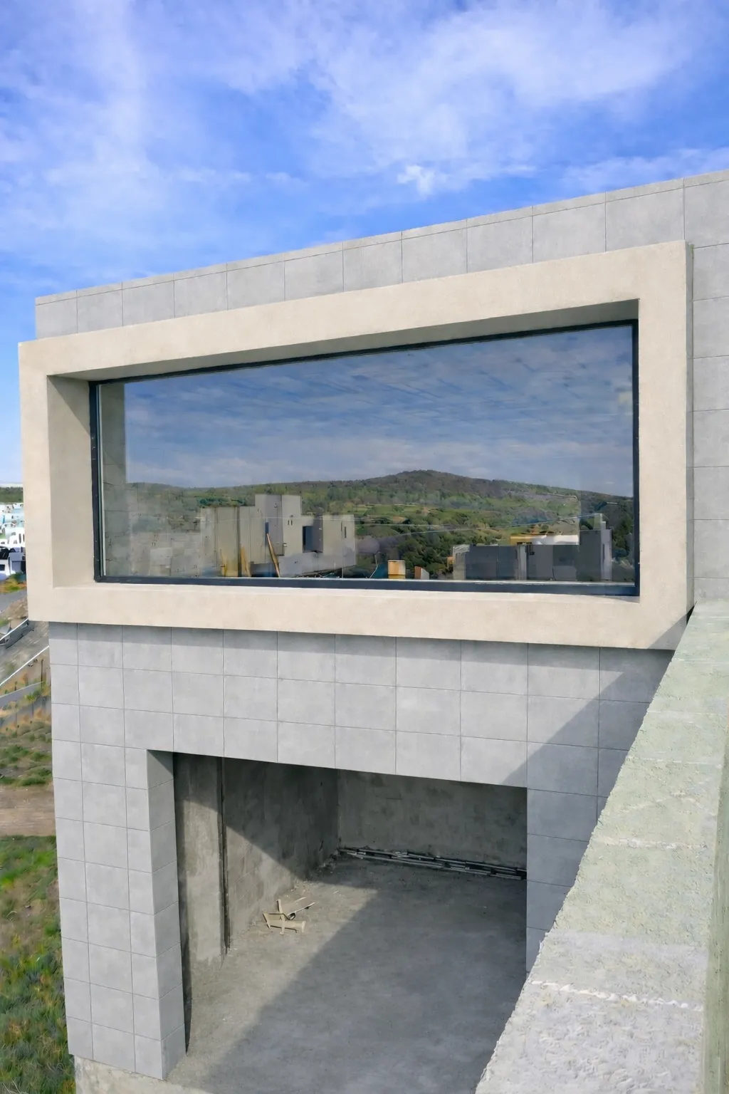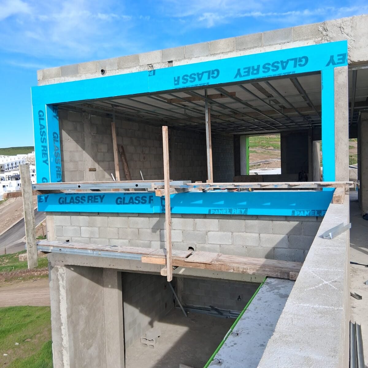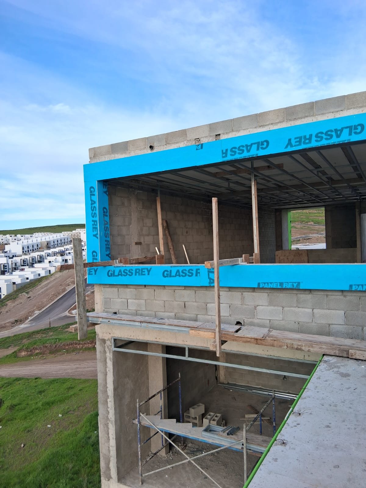 Modernización de fachada realizada por rosaritodrywall en Tijuana, Zona 5y10. El proyecto incluyó la instalación de una estructura robusta de perfilería metálica y un recubrimiento con hoja de yeso para exteriores en color azul. Este sistema, junto con un acabado final en color crema para el marco del ventanal, proporciona una solución estética y duradera contra la intemperie.
